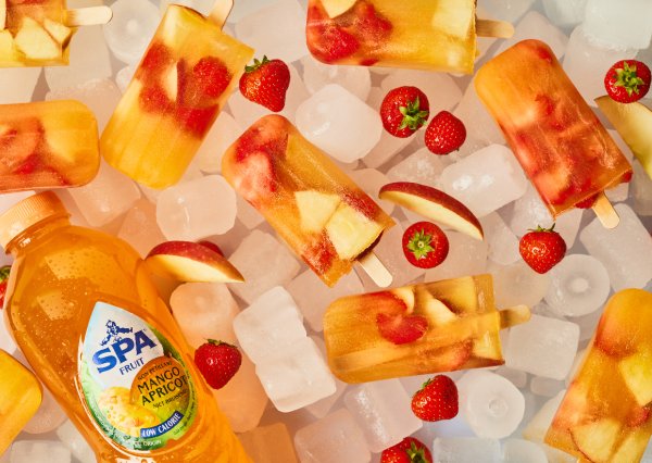Ces glaces aux fruits sont la parfaite friandise pour une journée d'été ! Préparez-les avec SPA® Fruit Mangue-Abricot, des fraises et une pomme. Rien de plus simple ! Laissez les glaces suffisamment longtemps au congélateur pour qu'elles soient bien gelées lorsque vous en profiterez.