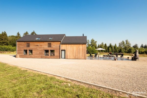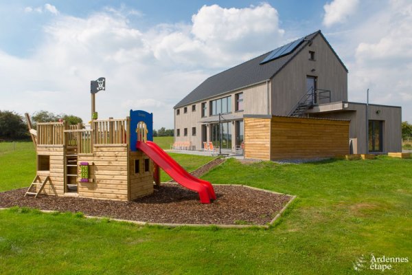 Une villa neuve basse énergie qui offre une vue panoramique sur l’une des plus jolies vallées de la région dans un endroit calme et bucolique. L’ambiance contemporaine et chaleureuse des lieux invite à la détente. Pendant que les enfants font un kicker ou profitent de la plaine de jeux extérieure, les mamans se détendent dans la cabine infrarouge. À l’extérieur, un bunker (oui, oui !) est accessible et éveillera la curiosité des petits et des grands. Et comme les enfants sont ici les rois, un ancien bâtiment, à côté du gîte, a été aménagé en salle de jeux avec terrain de badminton, table de ping-pong et billard.